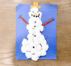 Simply glue cotton balls in a snowman shape on dark paper, then add tiny buttons, a paper carrot nose, and stick arms. Kids love the tactile experience of handling the soft cotton balls!